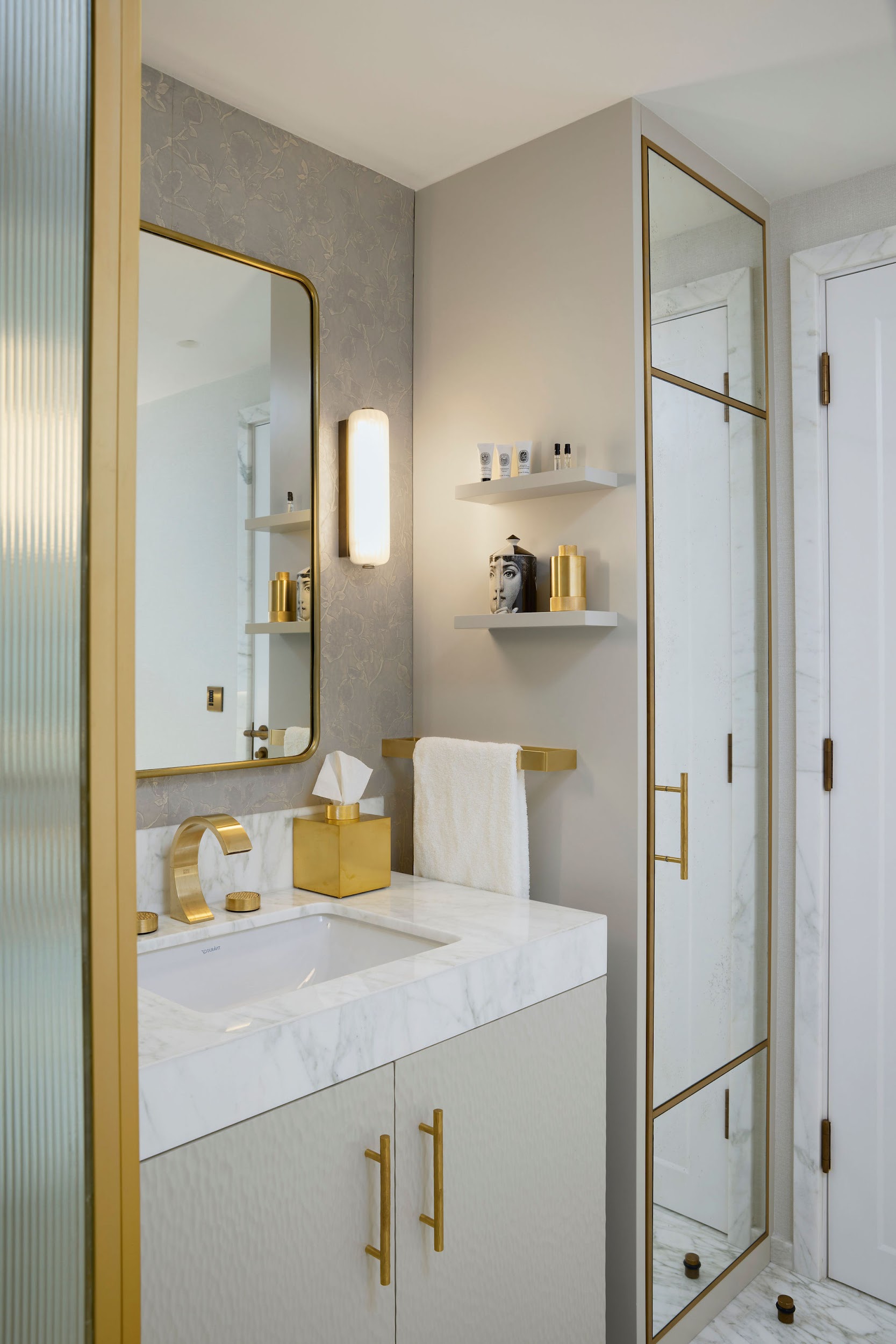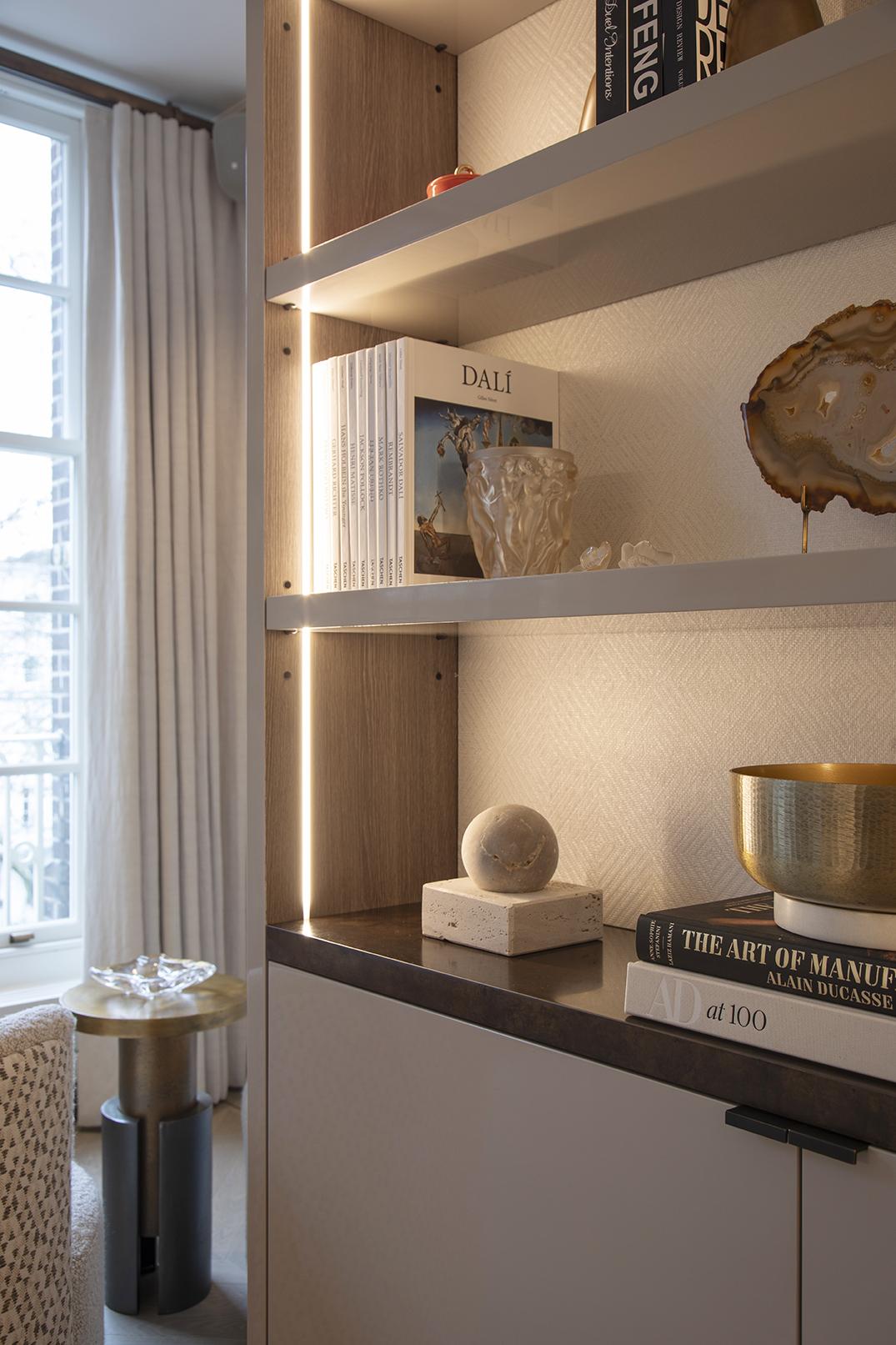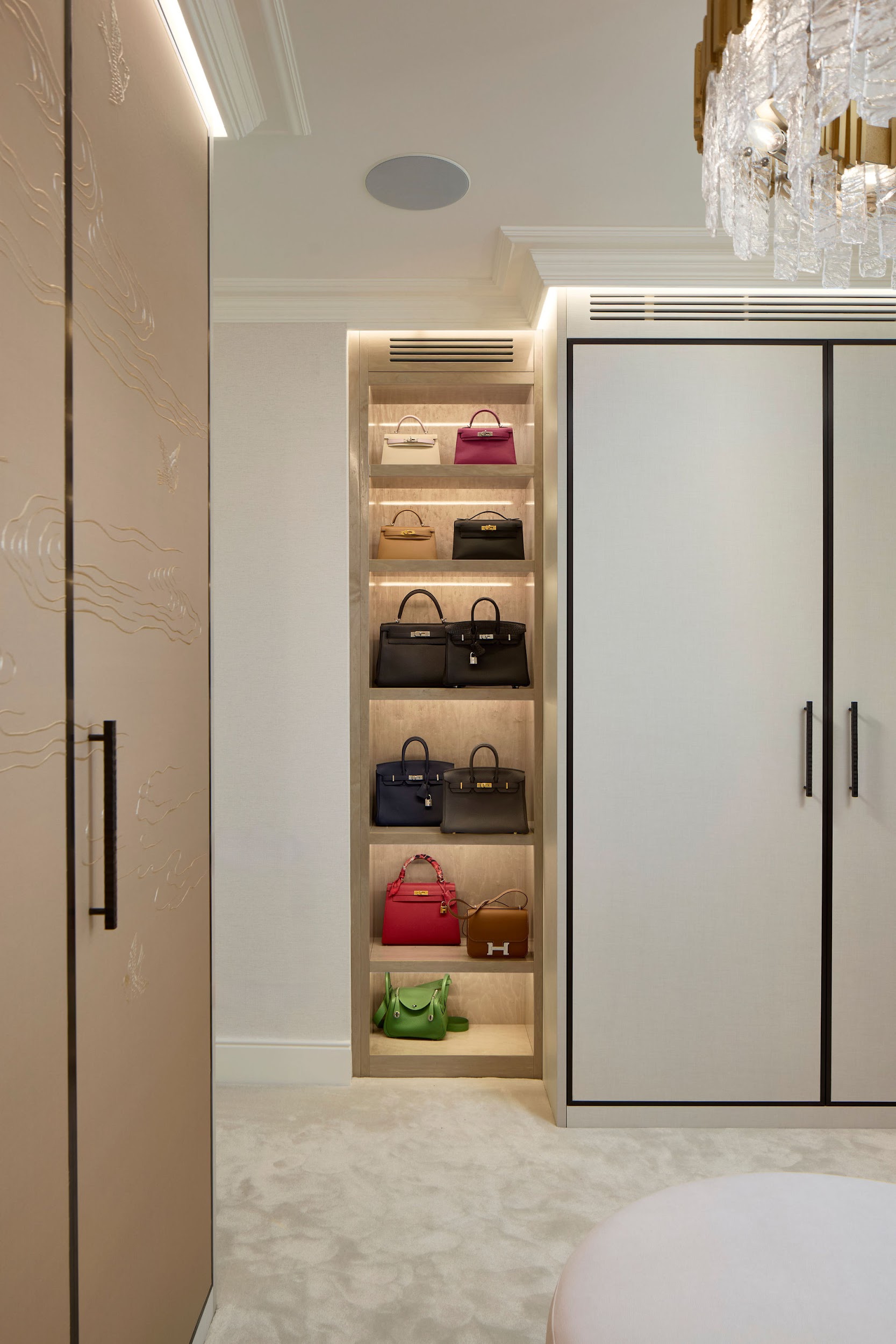 A fully bespoke interior where every surface was crafted to the client’s specification – from weathered bronze shelving units and hand-embroidered silk wardrobe doors to satin-finished eucalyptus veneer dressing areas with illuminated display niches.